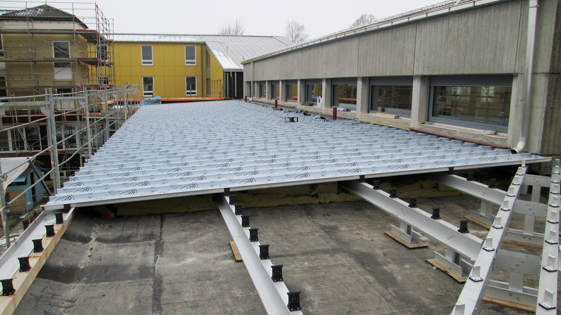 ca. 600 m² Alublech-Dacheindeckung mit Kalzip-Stehfalzprofilen, einschließlich Stahl-Leichtkonstruktion und Dämmung